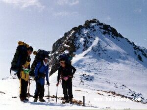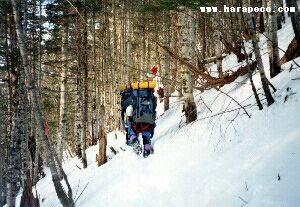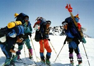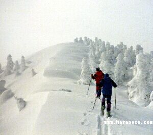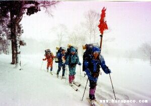| 降雪のなか、ルート旗を持って進軍する | 乙妻山登頂を果たしB.Cへつき進む |