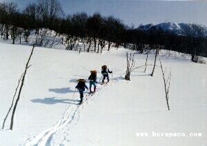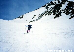 | 火打山から黒沢大斜面に滑り込む | 妙高山をバックに 最終目的地は近い。 |