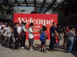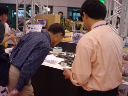 タミヤ模型を知っていれば、まあ合格、長谷川を知っていればおおっ!フジミ、アオシマ、ニチモ、ピットロードとなるともうオタクの領域か。そんな程度なので模型ショウといってもたいした人出ではないだろうとタカをくくっていたのだが、これまた会場に到着して驚いた。すでに1時間前なのにこの長蛇の列なのだっ!!ななな!なぜだあ。よくよく聞いてみると新作が事前に見ることが出来る以外に激安のジャンクパーツが出ていたり、結構掘り出しものがGETできるのがホビーショウなのだそうだ。 待つこと30分。ようやく会場に入れた。飛行機オタクのおやじはやっぱり飛行機のブースへ。製品担当者がうれしそうに説明してくれるのを熱心に聞きつつも作品をオタクの視線でチェックするオヤジの姿を見て「血は争えん」とつぶやく俺様であった。