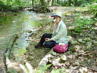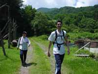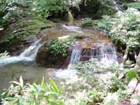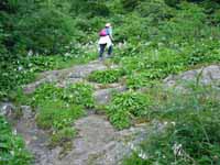 展望と風を楽しんだあと、インディアン高原を後にする。次第に雲は晴れ、太陽が顔を出す。いいときに来たとみんなで喜ぶ。下り道は沢をながれる水の音と、登りではあじわえなかった緑のシャワーを浴びてながら気分爽快で歩く。豊富な水(しかも冷たい!)を楽しみ、水辺で休憩。今日はいったい何人と出会うかなと人数を数えはじめる。中高年のグループが圧倒的に多い。福井人気の山とのことで総勢何人になるかカウントを始める。