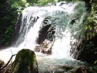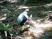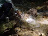 最後の沢の渡渉を終え振り向くと、まりも氏が水の中に手を入れてなにかを探している様子。?何やってるんやろ?「どしたん?」と問うと「カメラが・・・」はたして数秒後、水のなかから氏愛用のコンパクトカメラが救出される。渡渉の際にズボンから転落してしまったようだ。はたしてフィルムの運命はいかに?