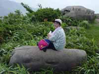 予想どおり、インディアン高原へのみちのりは笹、笹、笹である。最初は膝下くらい、次第に腰のあたり、胸と笹が迫ってくる。193cmのまりも氏は余裕の表情だ。私は文字通り露払いで下半身はべとべとになる。深い笹をこえるとそこは巨石が鎮座するインディアン高原だ。ここは谷から心地よい風が吹きつけ、大変気持ちがいい。「インディアン高原」などという変テコな名前を命名した敦賀山の会会員には感謝!である。今日はインディアン3名がこの高原で遊ばしてもらいました。