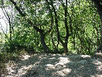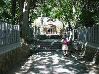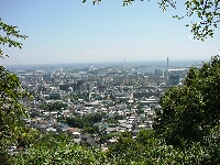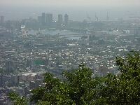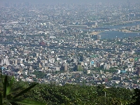 国道2号線を沿ってアプローチは自転車を使用する。自転車を使うのは今回初めてだ。今日は涼しくて快適。途中でナウシカは不動産屋を見つけてさっそく立ち止まってしまう。おいおい、今日はハイキングしに、え、おい、あらら不動産屋に入っていっちゃったよ〜。しかしそのみすぼらしい登山スタイルが災いしたらしく店員に適当にあしらわれたようである。よしよし。阪急岡本駅から豪邸の立ち並ぶ路をすり抜けながら保久良神社へ向かう。さすがに坂が多くなってきた。保久良神社の手前の橋で自転車を止め歩き始める。 保久良神社への道は途中まで舗装されている。車止めの横に「六甲山にクマが出ました。注意しましょう」という神戸市の看板があった。注意しろっていわれてもな〜。べらべら話をしながら足を運ぶ。展望は今日は最高だ。海のほうを見ると神戸の海がはっきり見え、海に浮かんでいる船や関空のほうもうっすら見える。すこし汗をかきたいので登山道を軽く走ってみる。心臓がバクバクいう。汗が出てくる出てくる。いい感じだ。しかし続かず。(汗)