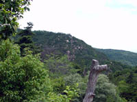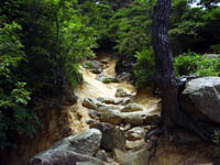 荒地山の山頂は樹木に囲まれて視界はゼロ。おまけに山頂マークもない。ちょっとガックリしたが、そのまま下りに入る。名前どおり花崗岩がごろごろしている。すこし下ると畳一畳ほどの岩の上にでるのでここからさきほど休憩した風吹岩を眺めていると下からおばちゃん2人おっちゃん1人が上がってくる。おばちゃんのほうが山慣れしてるらしくおっちゃんの手を取ってひっぱり上げている。こんなところスニーカーで下れるのかなと思って見ていたが、おばちゃん達がでっかい声で「ルートから外れたけど登れた!登れた!」と喜んでいるのを見て安心。でかい声から逃げたかったので早々と足を進める。しかしここはどーも下り向きのコースではないようだ。