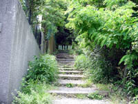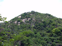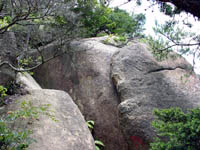 コンクリートの道を左手に神戸の港町を見ながら歩くとまもなく保久良神社の鳥居が見えてくる。神社の前には中高年おおじさんおばさんたちがおおきな声で談笑している。毎日登山で来ている方々だろう。神社の前に灯篭があるのでそこにすわってお茶でも飲もうかと近づくと黒いハエがぶんぶん飛んでいる。最初はなんだ、うっとおしいなあーと思っていたがなんか覚えのある匂いが漂ってくる。??と思い下を見ると草むらにう●こが・・・。うへ!誰ダーこんなところに(怒)息を止めて灯篭から離れる。俺様ははう●この匂いをかぎにここまできたんじゃねーと心の中で叫ぶ。 気を取り直して(笑)保久良神社の裏側から金鳥山を目指して歩く。新緑がまぶしい。風吹岩との分岐から道を右に分けると海は見えなくなり山に入った気がする。途中で後ろからMTBに乗った兄ちゃんが来た。途中までペダルをカラカラ踏んでいたがあきらめてMTBをひいて登っていた。道は次第に花崗岩がごろごろした道になってくる。前方から声が聞こえてくると風吹岩の横にひょっこり出た。