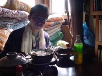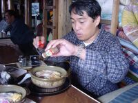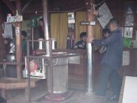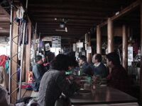 鍋割山荘の中に入ったとたんにメガネが曇って何も見えなくなる。(笑)奥では山小屋の主人が一生懸命鍋焼うどんを作っている。作るのに必死の様子だ。「鍋焼うどん2つください」というと伝票に名前と個数を書いてくれと頼まれる。なるほど。名前を書いて奥のテーブルで二人で待つ。中は人でいっぱいだ。我々は鍋割文庫の横に陣取り昔の山渓や岳人を見ながら30分ほど待つ。名前が呼ばれてとりに行く。期待まんまんでテーブルへ運ぶ。フタを一気に取る。おおー!すげー!思わず二人で叫ぶ。