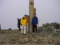 ところどころに植生保護と称した金網がある。すべて北側にあったのはなぜだろうか?塔の岳の小屋が木々の間からちらりと見えた。見えてからが遠く感じるのはなぜだろう。ほどなく金冷やしの分岐に着く。数年前訪れた時ここで卑猥なネタで盛り上がっていたことを思い出す。見上げるとひたすら頂上まで木でくみ上げられた階段がある。一汗かきたかったので一気に走るが、頂上手前でガス欠になった(笑)ゆっくり歩きながらこれまでの静かな山旅のイメージを打ち崩すのには十分なほど人工物の溢れる山頂に到着する。普段ならここからは抜群の眺望が楽しめるはずなのだが、残念ながらすべては霧の中。しばらく汗がひくのを待って尊仏山荘の中に入る。ひげを生やした山小屋おやじが迎えてくれる。我々はホットコーヒーを頼んだ。カントリーミュージックのかかる小屋は外見からの想像とは異なりかなり山小屋らしい山小屋の様子。手作りっぽいテーブルやランプに好印象。外の温度計をみると2℃。寒いわけだ。熱いコーヒーをゆっくり流し込み体を温める。