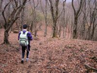 まずはデジカメで記念撮影。前来たときはデジカメなんてこの世に存在してたかな?って話ながらはふはふ食べる。食べて満腹になると後ろにある布団に二人とももたれかかりウトウトする。はあ〜ええ気分やあ。気が付くと11時に到着してからもう1時間半がたっている。このままでは根っこが生えてしまうので名残惜しかったが鍋割山荘を後にする。鍋割山荘の前では沢山の登山者が座りお昼ご飯を食べていた。カレーうどんを作っている団体の前で思わず「あ、カレーの匂いだ!」と叫んでしまう(恥) 鍋割山から塔の岳までの道は稜線上ではあるが木々に覆われた静かな小道である。すでに葉は落ち、みかん色をした絨毯が我々を迎えてくれる。さらに霧が立ち込め音をかき消す。二人で足音を止めると我々の息遣い以外は何も聞こえない。この世界を知らない人に教えてあげたいものだと心から思う。