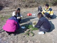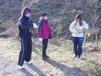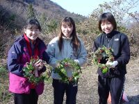 まりも氏はまだ宝塚ICとの連絡が入る。私たちは小金口のバス停で車を止めて霧の間に差し込む朝日を何枚か撮影した後、のんびり車を走らせて大タワに到着。1時間ちょっとで自宅から来れたのには驚きだった。駐車場は広く、まだ一台しか止っていない。再びまりも氏から電話が入る。どうやら1時間ほどまだかかりそうだ。さあてどうしようかな。さっそく駐車場の横に刈り取った木や草が大量に積んであったのをナウシカが見つけ、「クリスマス用のリースを作ろう」ということになる。ツルを引っ張ってぐるぐる巻いていくのだが、やっているうちに楽しくなってしまい、結果として大中小極小の4個のリースを作ってしまった。ナウシカは松ボックリやヒイラギの葉を集めて飾り付けをしている。何をしにきたのかわからなくなってきた(笑)そうこうするうちにまりも氏のご一行が到着。