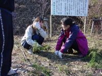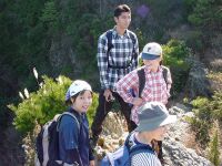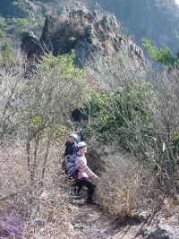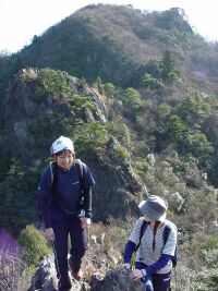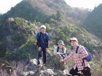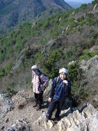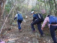 今回は現役の我が部の女の子2名も一緒だ。彼女達はなんとなんと我が部創部以来初めての女子の主将と副将なのである!パワフルな奴らとのうわさも聞いており、ドキドキしていたが、さすがに女の子。ナウシカのリースを見て「私も作りたい!」と到着するなり宣言してリース作りに夢中になってしまう。結局登山を開始したのは11時06分。まあ、たまにはこういうのもアリでしょう(笑)山の新たな楽しみを彼女達も覚えたかもしれません。 オオタワからは杉の森の中を登っていきます。現役を先頭にして歩きだすがさすが現役。歩くスピードが確かに違う!!(汗)なんか早いなあとぼやきつつ、しかし現役の前で「もっとゆっくり歩いてくれぇ」と言うのもなんだかなーと思い必死に呼吸して体を合わせる。尾根に乗る頃にはやっと体が慣れてきた。(ああ、よかったー)小金ヶ岳はごつごつした岩が尾根上にあり、なるほどアルプスっぽいといえばアルプスっぽいところだ。