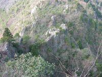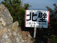 岩尾根の軽いUPDOWNをこなし、振り返ると三嶽が大きく鎮座している。なんとなく鈴鹿の雨乞岳のような貫禄だ。オオタワの駐車場から見たイメージとは随分異なる。写真を撮りながらさらに進むと「北壁」の看板が出現!うむ、たしかに北壁…。 多紀アルプスの絶景」(看板の案内文)をしばし楽しんだあと、山頂を目指す。小ピークを越え、急登を登りきるといきなり頂上に出た。「あれ?もう?」という感じである。