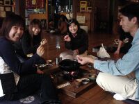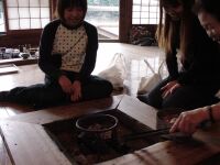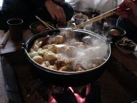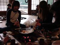 さあ、お風呂も入ってすっきりしたらあとはメシだ。昨日Webで他人の山行記録をいろいろ読んでいた際に「いわや」がお薦めと多数記載があったので温泉から電話するとまだOKとのことだったので、今回の登山口であるオオタワに戻り、小金口まで下る。ここから対向車が来たら絶対によけることは出来ないと思われる細い道を通って奥へ進むと茅葺の家が!そこが「いわや」である。暖簾をくぐると意外と店の中が広いのに驚かされる。地鶏のすき焼き(1人前3500円)を注文して、囲炉裏の周りに座る。最初に丹波名物黒い枝豆が出てくる。普段食べないので珍しくビールと一緒においしくいただく。そうこうするうちに野菜やお肉が運ばれてくる。炭火の上に鉄鍋が載っているので最初に野菜をいれ、その上に地鶏を載せてワリシタを入れて煮込む。お店のおばちゃんご指導の下、すき焼きをせっせと作る。
