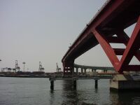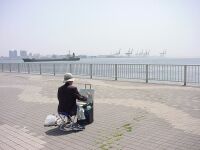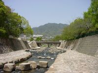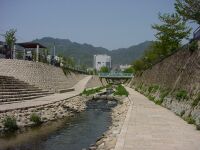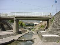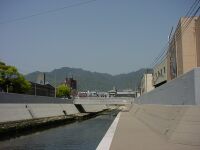 まっすぐ舗装された川沿いの道は余所見をしていてもつまづくものもないし、川に落ちることもない。阪神電車の高架が近づいてきた。ふと川に目をやると小魚が泳いでいる。それ目当てか浅い水面に釣り糸をたらして動かないおじさんもいたりする。阪神を越え、灘区役所がある間の川沿いは特に親水面が強化されているようで、綺麗である。中学生の団体がお弁当を集団で食べていた。 JRを超えると川は二つに分かれる。右へ進むと六甲川だが、今回は左手に進む。