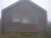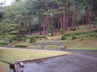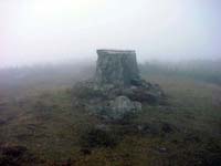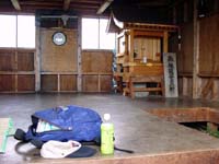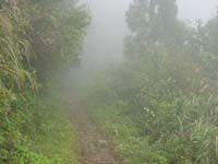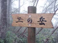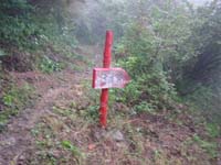 二の岳からはすこし勾配がきつくなるが、楽しい歩きだ。このあたりは自然林なのだろうか。道脇にはときどき大きな木がそのまま残っている。10分ほど登れば三の岳の看板に到着する。ここまでくれば頂上は近い。霧は次第に濃くなっているように感じる。しばらく登ると右手に茶色い小屋が見えてくる。避難小屋だ。先に頂上に足を進める。8:00ちょうどに頂上に立った。しかし予想どおり視界はゼロ。とほほ。小屋に戻ると小屋の外に赤いザックが置いてあるのに気が付いた。頂上でも誰にも会わなかったのに・・・。小屋の扉を恐る恐る開けてみたが、中には誰もいない。はて?幻覚と思い、もう一度小屋の外をみたが確かに赤いザックが雨ざらしになってある。???だ。