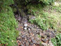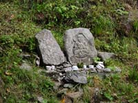 前回の氷ノ山に続き、また雨山行である。雨具の上のみをかぶり、ぼうしを深く被って黙々と進む。雨はすこし小降りになってきた。目指す山頂は当然のことながら見えない。睡眠時間はよく眠れたとはいえ実質3時間程度。最初ののぼりだしは結構堪える。 6時45分頃に最初のポイントの栃の木地蔵に到着。お地蔵さんが迎えてくれる。コップがおいてあったのでここで水を飲みすこし休憩する。