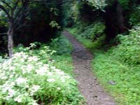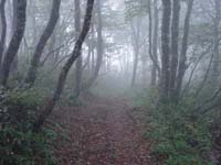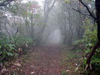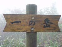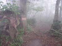 周りは霧で何も見えない。晴れていれば視界も開けてよいのだろうなあ〜。すこし進んだ先でお茶を飲み、ポッキーをかじる。こういうときテルモスを持って来ればなあ〜とちょっと後悔。雨降るなんて思っても無かったし。くそぉ〜。一の岳を過ぎても依然霧は晴れない。木のトンネルをくぐりながら20分ほどあるくと二の岳に到着する。大きな杉が迎えてくれる。