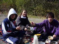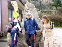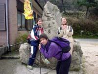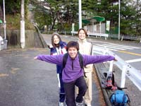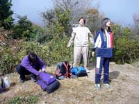 雨ヶ峠に下りると芦屋方面から登ってきた登山者が沢山居た。ここでは休まず、このまま本庄橋跡に向かう。本庄橋についてびっくり。どこかのボーイスカウト?の団体が車2台で乗り付けて本庄橋のテント場の真中を占領していた。あらら、こりゃちょっといかんねえ。車でこんなところ来て欲しくないなあ〜。(てゆうか、担いでこいよ、大人たち!) 頂上付近はおそらく相当寒いだろうからということで、今日のお昼はここで取ることにする。水を汲みにいき、豚汁を作る。後輩達には隠していたので、みんな驚いたようだ。ふっふっふ。予定外なのはこの季節ハズレの寒さだけだ。おにぎりをほおばりながら豚汁をすすって昼飯を楽しむが、強い風が時々吹き、食事を終わって片付けるころには朝より寒い風がふきつけてきた。 さあ、ここからは七曲りを経て六甲の山頂である。しんどいで〜とすこしだけ脅しておいてゆっくり歩きだす。今日は三菱電機の神戸の家族登山大会があるらしくゼッケンをつけた登山者が多い。一軒茶屋の前に出ると下は雪が積もっていた。しかもめちゃ寒い!一軒茶屋を覗くとコーヒーが400円だったのでみんなキャンセルして外でお菓子とお茶をボリボリ。最高峰登山口では三菱電機の軍団が炊き出しを行っている。くぅ〜、あたたかい湯気がたちのぼっている。ありゃかなり目の毒だあ。 さあ、登る前にと、トイレに入り、小をする。めがねが湯気で曇ってしまった。(汗)アスファルトの道をゆっくり登っていくと六甲の山頂に到着する。ちょっと拍子抜けする山頂ではあるが、山頂には変わりない。記念撮影をしたあと、神戸の港町をみながら下る。このころから雪が本格的に降ってきた。