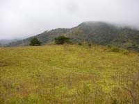 高級住宅が左に見えたところから山の斜面を登り始める。尾根にはすぐに出る。振り返ると奥池がはっきり見える。出来るだけ景色を眺めてもらいながらゆっくり歩く。歩きにくい掘割を登っていくと前に中高年のグループが見えた。30分で東お多福山山頂に到着。雨は止んでおり、雲は我々の目線と同じ高さだ。しばし景色を楽しむ。中高年グループは土割堀(ドビワリ)峠へ降りていった。我々は雨ヶ峠に向かう。東お多福山のなだらかな稜線を歩いていくとすばし ハイキング気分が味わえる。これが狙いのひとつ(^^)。しかし寒い!そのうちミゾレがぽつぽつしてきた。うーん、安定しない天気である。