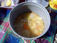 今回は私以外は全員初心者だったので、晩秋の山を楽しむのはやっぱりメシだ!ということで印象度UPのために汁物にしたが、当日は11月なのに12月下旬の寒さというとんでもない寒波が到来してしまい、効果は絶大だったと思われる。(^^)! |