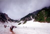 無料駐車場に車を止めてここで用意をし、裏手にあるアルピコバスターミナルに移動する。ここから猿倉までは900円だ。始発の5:50発のバスに乗ることが出来た。ザックを見ると幕営装備をしているのは私だけだ。ここから猿倉までは細い道をくねくね行く。途中後ろからドスンという音がする。振り返ると私のザックがバスの後ろのステップに落ちているではないか!後ろにいた係員のおやじが居眠りをして私のザックについているピッケルを離したようだ。おもわずムっとする。そんなことなら最初からきちんと積めばよいのに・・・。 猿倉に着くとどこから沸いたのか(失礼)すでに登山客でいっぱいだった。ほとんどが中高年・・・。しかもみんな小屋泊まりの装備。小屋は混んで大変だろうな〜。バス亭の前で軽く体操をしたあと、ザックを担ぐ。う!重い!家で重さを量ったら3泊4日分(予備含む)で20キロあった。アイゼンとピッケルを用意し、一眼レフをもったりと、欲張るとこういうことになる。それにしても重く感じる。バス亭からトイレまでの坂ですでに不安を感じる(汗)こんなんじゃ山屋失格です・・・。 白馬尻小屋までは林道を1時間ほど歩く。同じく歩き出した中高年団体軍団にことごとく追い抜かれ気が付けば最後尾(涙)学生時代、彼らを横目にどんどん歩いていったことが全く信じられない。汗がバンバン吹き出てくる。歩きにくい砂利から樹林に入って一登りすると小屋が見えてくる。あー、やっとついた。水を飲み、チョコパンを食べる。大雪渓は6月末の大雨で中央部が崩壊したらしくルートは左側になっているとの看板がでていた。幸いなことに雨はなく、アリのように人が見える。ここから踏み出せばあとは引き返すか、頂上にいくかのどちらかの選択肢しかない。いっちょ頑張ってみるか〜。 白馬尻からしばらくあるくと雪渓の末端に到着する。ここまで来ると体も慣れてきたようで、元気がでてきた。しばらくはキックステップで十分だろうと判断し、そのまま歩きだす。先は長いのでゆっくり目のペースで歩く。しばらく歩くと左側の斜面を登ることになる。パトロール員が随所に立って案内をしていた。事故防止の為だろう。ここで大渋滞。慣れないアイゼンで岩と泥まじりの斜面を歩く人が多いのだから無理もない。はずせばいいのに・・・。ふたたび雪渓に戻り、登りつめるとモレーン状の斜面が出てくる。ここで一休み。ここから見える杓子の岩峰はまるで映画に出てくる魔王の城。想像力をかきたてられる。ここからがまたつらい登りだ。一歩一歩歩いていく。お花畑と呼ばれる場所につくころには登り始めた当初の天気は激変し、風と霧に。うわ〜。雨具を着込む。寒い。しかしもう引き返すわけにはいかない。 枕木の階段をひーひーいいながら登る。このあたりはもう気力。ふと顔を見上げると村営の小屋が見えた。あ〜ついた〜。小屋の前にザックを下ろし、財布を握って小屋の中に入る。小屋の中は達成感で満足そうな人たちでいっぱいであった。ここでおよそ山にはあわない金髪の兄ちゃんに幕営料金500円を支払、900円のラーメンを頼んだ。待つこと5分。きたきた!双六岳のラーメンほどではないが、十分おいしいっす。ラーメンを食べ始めると外から雨が降ってきた!との声が。慌ててザックを回収にいく。いやはやラッキーであった。