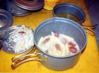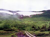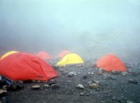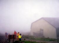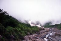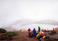 大雨のなか、登ることほどつらいことはない。ラーメンを食べしばし小屋でマッタリしたあと、テント場へ移動する。10張りほどすでにはってあった。私のとなりには「若商」と書いた大きなテントがあった。風が強いのでしっかりとテントを張り、中に入ってシュラフを出してマッタリする。しかし時間もあるのでカメラを持ってすこし歩く。全く気が付かなかった高山植物がたくさんある。カメラに収め、テントに戻るとまた大雨。うとうとしていると前の若商のテントからおい○○!飯はまだか〜と声が。どうも先生のようだ。生徒がまだですぅーと答えている。東北のほうだろうかかなりなまっている。ありゃ、もうそんな時間か。じゃこっちも飯にするか。きょうの食材は以前に購入してそのままになっているものの整理なので目新しいものはない。家計も節約である。さすがに飽きてきた。新メニュー考案せねば(笑)6時頃になると雨がやんだので水を汲みに雪渓まで下りる。下からはまだ上がっている客がいた。テントに戻るとまた雨(涙)ラジオをつけるとリクエスト形式のナツメロ。中島みゆきの時代がかかっていた。天気予報ではどうも回復の兆しは無いようだ。明日の予定を考えるべく地図とにらめっこしながら9時過ぎに寝た。