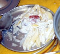 ゆでたペンネにパンに塗って焼く用のマヨネーズ(コショウ入り)をあえたら出来上がり。 |