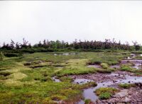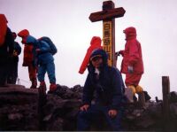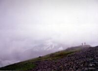 うっ!重い・・・下半身が異様に重い。一歩一歩歩くがつらい。白馬小屋でさっそく休憩。視界はまったくない。雨雨雨である。ここで引き返すのも悔しいので白馬岳までこれまた牛歩のごとく進む。頂上はやはり風と雨。あーあ、とおもっていたら、おばさんが「あー!」と歓声をあげる。ん?振り返ると雪倉や朝日のほうがガスがさーと晴れて見えるではないか。こりゃ山の神様からのご褒美かな?すこし気分がよくなる。 さあ、三国境まで下りるかとザックを背負うとカップルから声をかけれらた。「あの〜栂池ってこっちですよね〜」と白馬山荘のほうを指していう。そりゃあんたが歩いてきた方角やろ・・・と思いつつ、いつもは冷たい僕も山の神様からご褒美をもらったことで仏になり、地図で丁寧に教えてあげた。この霧では無理もないけど、これからはきちんと地図はもってきましょうね〜。と心の中で指導(爆)