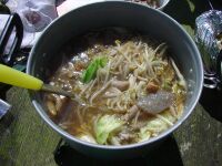 美女Eさんがひとりで材料を歩荷していただきました。醤油ベースの汁にもやしやキャベツなどの野菜がてんこ盛り、これにソーセージやお肉がたっぷり入ってました。僕は火を付けて時々かきまぜただけです。 |