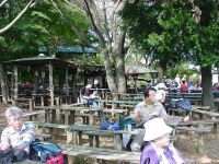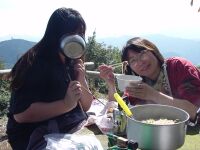 さあ、ここからEさんの待つ景信山までもう一がんばり。展望があまりきかない樹林の中をUさんと歩く。やはり右足の指が痛い。うーん、なんでだろ〜。でも言うのもかっこわるいので黙って歩く。高尾山はナメてましたが、縦走すると意外と山気分が味わえるいいかんじの山。ほどよく汗をかてきたころに景信山のテラスの端が下から見えた。お!もうすぐだ!なべだ!テラスに到着し美女Eさんを探すとすでに角のテーブルを占拠し、待っていてくれた。鍋の材料を一人で歩荷する羽目になってしまったEさんですが、美女Uさん曰く「まあ、今回は罰ゲームのようなもんだな」(^^)で帳消し! さっそくビールで乾杯!冷えていたビールもこの天気と暑さですっかりぬるくなっていた。ありゃりゃ。私はまだ肝臓の調子がよくないので控えめに。酒のアテにポップコーンを食べながら、なべを作る。いや〜野菜不足にはこりゃたまりません。ビール目当てに蜂がぶんぶん飛んでくるなかでバクバクたべさせていだきました。