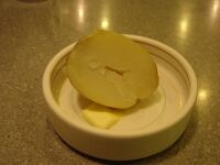なべができるまでの酒のアテとして食べる。バーナーの上に直接置くとばんばんに膨らんでくる。いきおいよく湯気がふいてきたら出来上がり♪ |