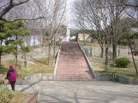 さてと、登山道はいったいどこだ?きょろきょろする。目の前にある階段はいかにもそれっぽいが、たしか違うはずだ。新管理人ことフィオ嬢も歩きたがっている様子だったのでベビーカーから下ろしなるべく平らな道を選んで歩く。公園の対岸にはUSJが見える。おー、USJだあと眺めてるとふと植え込みのところに銀色のキラリと光るものが。なんじゃこりゃ? あっけなく三角点と頂上を発見することが出来た。新管理人ことフィオ嬢もニコニコしながら二等三角点を踏み、頂上の看板のところで記念撮影をしようと近寄ってきた。さあ、こっちにこいと手を伸ばした瞬間、ずっこけてしまい、ヘディングの要領で天保山にいきなり頭突きをかます!(T_T)どひゃー!初登頂は予想どおりの大泣き。おでこに立派な勲章が出来てしまった。それでもすぐにいつものニコニコに。このあたりの切り替えのよさ?は母親のナウシカ嬢にとても似てる(爆)