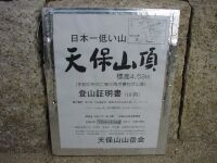 | 【山行日記】 あっという間に一月も終わりだ。特に今週は忙しく時間が過ぎるのもあっという間だった。金曜日も仕事が終わらず、仕事を持ち帰るはめに。(といってもやってない!いまからしなくちゃ)週末はリフレッシュをかねてどこかに行きたいなー、でも本格的な山は準備もしていないし無理だなあと考えていたところ、ふと、妙案が浮かんだ。そうだ!家族でも行ける日本最低の山に行こう! 神戸からは阪神高速湾岸線に乗ると天保山には15分から20分で到着する。実はとっても近い。あっという間に到着し、サントリーミュージアムの地下に駐車する。海遊館は入場料大人一人で2000円も取られるのでパス(爆)まずはマーケットプレイス内の「なにわ食いしんぼ横丁」に突撃する。自由軒と北極星にはお昼前なのに行列ができていた。北極星は行ったことないけど、自由軒は本店に仕事中に何度か行ったことがあった。ふるくさーい店でほとんどの客が名物カレーを食べる。よく考えたらなにわ食いしんぼ横丁に行ってもそれほど目新しいものはないことに気が付いた。アホや。(爆)てことて、うどんでもくうかあということになり、ぶっかけ十三に。ナウシカ嬢は頼みもしないのに勝手に「大」で注文しているし。おなかいっぱいになった。(^^) 腹ごしらえしたら、いよいよ今回の目的の天保山に向かう。インフォメーションで場所と証明書を発行してくれる天保山山岳会の場所(喫茶山小屋)の場所を確認し、観覧車の横を通って公園に向かう。公園は大阪のどこにでもあるような汚い(失礼)公園。これまたどこにでもいてそうなおばちゃんが鳩にえさをまいていたが、よく見るとギョウザだった。そのままの形で地面に落ちている・・・そんな餌くうんかいな?