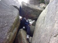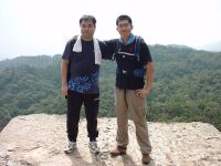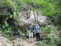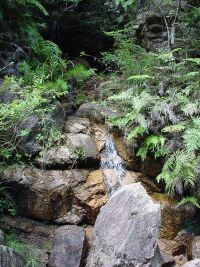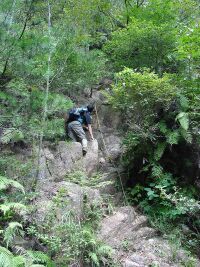 | 【山行日記】 9月11日 先週ひさしぶりに後輩のまー君と堂島の焼肉屋に飲みに行った。その席で「じゃあ、今度山に行こう」ということになり、まー君は社交辞令のつもりだったかもしれないが、私はすっかり本気にしてあたまの片隅にインプットしてた。 そして土曜日。明日は天気がもちそうだということが分かったので、まー君に電話してみる。個人携帯を鳴らしてもつながらない。仕方ないので自宅に電話すると奥様が出た。どうやら仕事にでかけているらしい。あらら休日出勤や。会社の番号を教えてもらって、電話すると「12日はOK」との返事が戻ってきた。まー君にはもうひとりの胸毛コヤマに電話してもらうように頼み、私は近所に住むギーハラに電話をする。彼はどうやら先約があるようで、明日は無理とのことだった。ふむ、残念。 9月12日 朝方に雨が降ったようだが、天気はもちそうだ。デイパックに衣類を詰めていると電話が。ギーハラからだ。「やっぱ行きます」との返事。近くのラーメン屋で待ち合わせ阪急の駅まで歩く。聞くと本当は奥様と一緒にでかける予定だったらしいが、「とっても山に行きたそうな感じ」だったらしく、奥様に「いやいや来るならこなくてイイ、山行ってきぃ」と背中を押され?追い出されるように出てきたらしい。(大丈夫かなあ→どうも大丈夫じゃなかったらしい)阪急芦屋川のコンビニで弁当を購入したあと、花時計の前でひさびさにストレッチをする。待つこと数分、長尾からまー君が登場。あら、立派なお腹(^^)ついに90キロを突破したとのことだった。 さあ、登山の始まり!10時に駅前を出て豪邸を見ながら歩くこと約30分、高座の滝に到着。ここで一服したあと、高座谷を目指す。堰堤にはイノシシの親子がいた。どーもこんにちは(^^)ここから川沿いを歩き、地蔵のある滝を越えると第二の堰堤に出る。ここにはもっとでっかいイノシシがいる。登山者のまくパンの耳をたべていた。はてこれはよいのだろうか・・・。 ここからは地図を見てもはっきりとした道はないが、まずは川の左に渡って歩く。堰堤をひとつ乗り越したあとにふたたび、右側に戻る。どうやら、最初から川の右側を歩いていても同じ道にきたようだ。ここからゆるやかに上り、やがて風吹岩との分岐に出る(標識は無いので地図とにらめっこしよう)ので、右側の堰堤のある川原に下りて岩がごろごろした道を川沿いに歩く。すこし進んで右側をみるとキャッスルウォールの基部が見える。奥高座の滝はここからさらに川沿いに歩く。すこし藪が濃くなった場所を抜けると突然水の流れる音と滝壷の底のような風景が飛び出す。そこが奥高座の滝だ。周囲を岩壁に囲まれており、かなりいい感じ。前回来たときは無かったロープが設置されていた。今回も滝の横の壁を登るが、ロープがあってもやはり緊張。すこしでも自信が無ければ迷わず引き返そう。キャッスルウォールの基部からの巻き道がある。