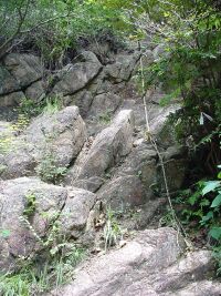 食事をとりながら仕事のこと、家庭のこと、いろいろ話をしているうちにすっかりと汗もひき、心地よい風についつい長居したくなってしまうが、そろそろ行こうかと腰をあげて出発する。帰りは稜線上を歩いて芦屋に戻ることにする。この帰りのコースは岩がごつごつして岩好きにはたまらないコース。思いっきり楽しみましょう。樹林帯にはいり、振り返ると荒地山が大きくそびえている。ここから高座の滝まではずっと樹林帯であるが、城山への分岐でふたたび高座の谷に下りる。風が本当に気持ちよい。それにしても今日は大変のどが渇く。ばててるのかなあ。汗をたくさんかいたので塩分も流出しているようなかんじだ。芦屋の駅についたら、ドリンクをかぶのみしよう!と約束し、下山する。