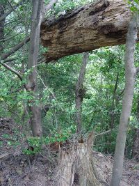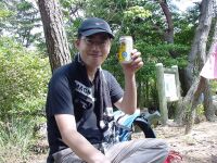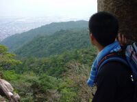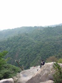 高座の滝の右横の壁を登ったあとは川沿いにさらに進む。道は川からすこし上に上がるが、途中で川に降りて、奥高座の滝の上部までいく。ここからみる芦屋の町と六甲の谷の深さは絶景だ。あまり人気のないスポットなので静かな山旅をしたい人にはお勧めしたい。 奥高座の滝を過ぎると道は平らになり、大きな松ノ木の大木(黒岩)のあたりから荒地山まではきつい勾配が続く。黒岩の景色を見てもらいたくてこの尾根を選んだのだが、残念ながら、先行者がすでにおり、我が物顔で岩の上で寝ていた。うーん、もうすこし場所をあけてくれてもいいのにな、とすこし思ったが、その様子はみられなかったので、私達は黒岩の下を巻いて、黒岩より谷に近い、岩のテーブルの上でまったりとしていた。景色はここのほうがいいが、やはり松ノ木がパラソルの役目を果たしている黒岩がいちばんいいスポットだ。しばしまったりしたあと、頂上を目指す。あとはもうふとふん張りだ。樹林の中をひたすら登る。うおおおお!頂上は残念ながら展望はないが、汗をかきまくったタオルの大変よい香りをかぎながら、しばしの充実感を得ることが出来た。ギーハラ君がビールを持参しており、みんなで回し飲みをさせてもらった。ごっちゃん♪