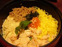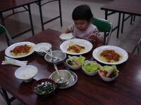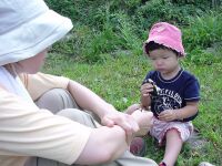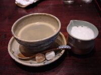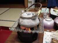 | さあさあ、夕食でございます。おお!これはまつたけの土瓶蒸しだ。新管理人が飲みたいというので試しに飲ましたら「もっと飲むー」とリクエスト。結局半分飲まれてしまった。2歳からグルメでは先が思いやられる。 |