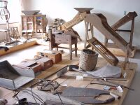 民俗資料館とかいてあったので覗いてみたが、かっての農機具を中心に「置いて」あるだけ。もったいなあ。もすこし気合いれないと。なによりも日が思いっきり当たっている。こりゃすぐに痛むぞー。ナウシカ嬢がぼそっと「この当時の機械ってほとんどリサイクル可能やね」、よくみるとほとんど木製。 |