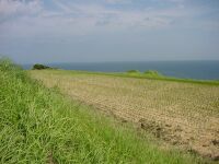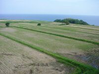 海のほうまで張り出した棚田。緑と青のコントラストが大変美しかった。いまはもう収穫をして田は綺麗な状態であった。 |