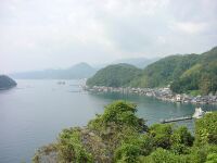 | 道の駅から伊根湾を望む。船屋がずらりと並んでいるのが見える。船のガレージがそのまま湾に面している独特の建物。丹後の名所のひとつであり、観光客も意外と多かった。道の駅からの景色が一番サイコー。 |