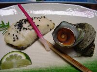 こちらはすすきのごま焼きとサザエのつぼ焼き。このほかにはもの鳴門巻きや地物の梶木鮪、鯛、かんぱちの刺身など魚中心の料理を楽しみましたよん。はあ〜うんまい。 |