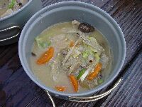 | あんまり歩いていないけど早速ランチタイム!寒くなってきたのにおにぎりだけでは寂しいとのことで前の晩にナウシカ嬢が用意した豚汁を作る。おいらは温めて配膳しただけ(笑)寒い時はやっぱコレやね。(^^) |