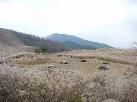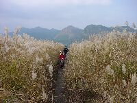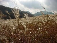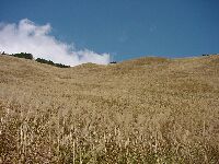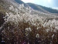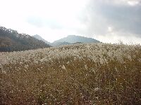 ススキの穂が太陽の光で時には銀色、時には小金色に光輝く。黒い雲はこのころから急速に流れて行き、太陽がちらりちらりと顔を出すようになった。 |