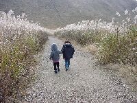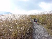 ススキに囲まれたお亀池周辺の散策路をおチビちゃん2人が歩いていく。なんとものんびりした風景。 |