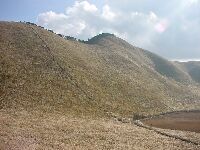 左から登る筋が登山道。その先が亀山峠。もうすこしだ!ここは毎年3月に山焼きをするとのこと。 |