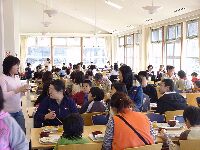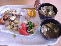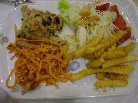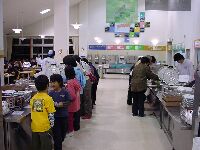 | 晩御飯は指定された時間に食堂に行く。バイキング形式であるが、子供の宿泊が多いだけに内容も子供向け(笑)お味噌汁のかわりにクリームシチューが出ていた。バイキングと聞くとどうも欲がでてしまいおかわりしてしまう(笑)ああ〜また体重があ〜。出来ればもうすこし和食を増やして〜。 |