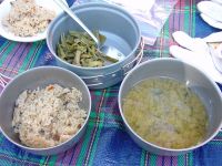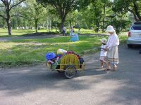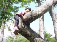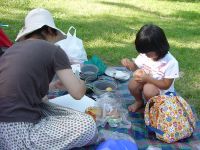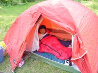 | 8月10日 7月の海の日に立山に出かけた。当初はこの旅行で、登山、高所キャンプ、を体験し、さらに帰りに日本海で泳ぐという山海、キャンプという夏場に押さえておきたいポイントをすべて一航過でやり遂げる予定であったが、神様のいたずらか?見事に雨に遭い、予定になかった温泉旅行+他人の家に転がり込むというおよそ当初の目的を達成しない旅行と相成ったのでございます。てなわけでそれはそれでとっても楽しめたわけではありますが、どこから心にひっかかるものがあり、8月の5日に若狭和田で海水浴をしたら、次はキャンプとくるわけでございます。 朝、6時に起床するはずが見事に寝坊。7時過ぎに出発して北陸道経由で妙高に向かう。天気は2日はもちそうだ。今回は前回の反省を活かして天候悪化の際のことも少しは考えて家を出発したのである。といっても雨降ったら田舎にさっさと引き上げるってな話なんですけどね。 妙高に到着するとあたりは雲でなんも見えない。あららら、こりゃいかんなと思っていたらささーと雲が切れていき、焼山や黒姫山が見えるではあーりませんか。こりゃラッキー。テント場もまだお盆前か空いている様子。テントはフリーサイトのため、どこでも好きなところに張ることができる。森の中に囲まれた素敵なキャンプ場。オートキャンプ場は別区画ということもあり、また車からサイトが離れていることもあってマナーのいいキャンパー達が集うところらしい。受け付けを済ませさっそくリヤカーを借りてテントサイトへ。すでにテーブルのあるいいサイトは先着者に押さえられていた。そりゃそうだわな。我々はいわゆる普通のキャンプ用具は一切持っていなくて、実際は登山で使うものをそのまま持ってきただけである。だから洒落た机も椅子もなければ、もちろんランタンもないし、バーベキュー用のコンロも網もありゃしない。食料も冷蔵庫にあるものをひととおりそろえ、あとは前回の立山で食べることがなかった食料をここで使うべくそのまま持ってきた次第。 しかし、こういうところに来るとどうも・・・みすぼらしく感じてしまうのである。なんせまわりはタープをガーンと張り、家のようなテントに、テーブルと、まるでアウトドアのカタログから飛び出してきたような風景がほぼ全周囲にわたり、展開されているわけである。こちらはといえば、ビニルシートに赤いダンロップの山テントである。娘もさすがに「あっちのテントがいい」とぶーたれていた(汗)タープくらいは9月くらいに安売りのを買おうと決意した次第である。 ![]() さて、今日の晩はトマトシチュー。ご飯を炊くのも面倒なのでマカロニを放り込む。娘はたまねぎの皮むき、卵の殻むきとすこしづつお手伝いができるようになった。シチューができるまで、娘はテントでごろり。テントで寝るのはやはり子供は楽しいようで、すこし興奮気味。 周りから焼肉の匂いが漂ってくる中、焼肉だけがキャンプメシではないのだ!と心の中で言い聞かせ、食事開始。しかしやっぱりこういうところくるのならメシは豪華にしたほうがいいですよ、ほんまに。次回の反省でございます。 星が夜空を埋め尽くすころ、ろうそくに火を点し、花火に点火。小さな火の芸術を夏の夜に楽しみました。 8月11日 朝の1時ごろ目が覚めて外を見ると月の光がまぶしい。明日も快晴だなと再び床につく。テントで寝るのはひさしぶり。どうもしっくりこないのか、眠りが浅い。いや、きっと興奮しているのかもしれない。やはり山に来たら薄いシートを敷いて寝るに限る。田部重治の「山と渓谷」にある一節を思い出しながら一人悦に浸るこの静寂な環境もまたよろし。 ![]() 予想どおりの快晴である。昨晩炊事場でおじさんにもらったメスのカブトムシ。オスを朝起きて探してみたが残念ながら見つからず。代わりに見つけたのはフンコロガシ(笑) 今日の朝ごはんはレトルトごもくご飯にあさげ味噌汁と山クラゲ。あっさりとした朝食でございます。ほんまならコーヒーにパン?なのかな。さすがにラーメンは却下。 朝あまりにも天気がいいので、「一人で火打山に登ってきてよい?」と嫁さんにせがんでみる。「いいよ〜、行けるのなら」となにやら含みのある言い方。たしかに軽い気持ちで登れる山ではないな。しかもほぼ丸一日家族をほっぽりだして・・・となるとちと無理か。みんなで高谷池くらいまでどうかなと提案するもこれも見事に却下・・・。最初から背負子はいらんと家に置いてこられた時点で負けだったかも。というわけで今日は笹ヶ峰牧場の散策。 牧場から眺める黒姫山この牧場がまただだっつ広いのなんの。普通の牧場をイメージしていたらあきまへん。キャンプ場から歩いて横断しようとするとかなり時間がかかるので、1時間ほど散策したあと、キャンプ場に戻って車で管理センターのほうに移動。ここでようやく牛さんを発見。いやはや広大とはまさしくこういうところにふさわしい。県民の