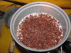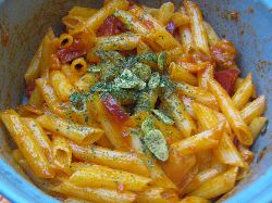 あの下痢はスキムミルクによる急性下痢だったんだと判断し、予定どおりの夕食メニューを作ることにした。今日はペンネのガーリックトマト味。考えてみると、胃には負担のかかるものばかり。急性だったからよかったものの、これがそうではなかったら、すこし体調が悪いとき用に食べるものも考えておかねばなるまいなと思った。 ガーリックトマトソースはオーマイの製品。フライドガーリックとパセリがついている。フライドガーリックは乾燥しすぎなところが残念。それ以外はGOOD。これは愛用したい一品。ただ、コッヘルが汚れるので掃除の際には先にペーパーで拭いてから洗えばOK。