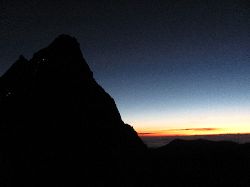 | 8月24日 最初に書いておくが、この日は私のいままでの山行では経験したことのない試練の連続であった。若干汚い話というか、ほぼ汚い話が中心なので覚悟の上(?)読んでいただきたい。 朝、3時に目が覚めたので、外を見ると満天の星空。今日も快晴が期待できる。ご来光を楽しみたいので早めに食事を済ませることにした。昨日ラーメンで飽きたので、これも16年前に試したチョコフレークとスキムミルクの組み合わせ。スティックタイプの使いきりスキムミルクが近所のスーパーにはなかったので、袋タイプのものを買い自分で小分けしたのだが、これがそもそもいけなった。お湯を沸かし、スキムミルクを入れて溶いたとき、嫌なにおいがした。なんだろう、オエ!という感じ。でも、朝は食べなきゃと無理やり胃に流し込んだ。濃すぎてすぐに水を飲んだ。要するに、スキムミルクの量が多すぎたのだ。そういえば、小分けにしたときに紅茶と一緒に飲むように大目に小分けをしたことを後になって思い出した。やはりボケている。 テントの外に出ると東の空が次第に明るくなってくる。カメラを持ってずっと待っていると、槍ヶ岳で御来光を拝むために登る登山者のヘッドランプが良く見える。100m以上照射してるのでは?と思うような光も見えた。さながら夜のパチンコ屋の夜空を照らす照明みたいだ。これは装備更改せねば。でも、このヘッドランプも20年使った思い出のヘッドランプなんだよね。5時10分、待ちに待った御来光。日常生活をしていて太陽が昇ってうれしいと感じることはほぼないのに、いつもながら不思議に思う。場所が変われば、同じもの見てもこんなにありがたがるんだから、人間はやっぱり勝手?