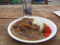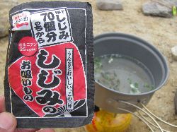 そんなわけで双六小屋への下りは20分で下りられるところを40分かけて慎重に慎重に下りた。下痢はすでに止まっていた。一体なんだったのだろうか。念のためと思い、富山大学の診療所に行ってみることにした。声をかけたが誰もいない。ベルを鳴らしたけども、誰も出てこない。おいおい、意味ないじゃん。ドラマでかっこよく演出していたんじゃないのー。槍ヶ岳で牛丼食べていたとき、横にいた医師の人から「山の診療所では簡易手当てくらいしか出来ないから、医者は登山に出かけて診療は学生任せが多いよ。」という話を聞いていたが、本当だったのか。やれやれ。いや、もっと悪くないか、誰もいないって。まあ、仕方ねーか。 わりとあっさりあきらめがついたので、あとは自分で治すしかないと腹をくくった。テントを設営し、すぐに熱いお茶を2杯飲んだ。どきどきしながらテントの中で待機。まてどくらせど・・・あれ、こない・・・。おお、どうやらおさまったようだ。いったいなんだったのだろうか。次は足だ。靴下を脱いで見ると足の指が2本小さく内出血していた。幸い爪ははがれていなかったが、すこし浮いていたので、テーピングで押さえておいた。テーピングは16年前のものだったが、十分使えた。すごいぞ、J&J。って古いすぎるわな。 しばらく横になって休んでいると、腹が減ってきた。 お、これはもう大丈夫と確信。(早すぎ?)昨日牛丼を食べたので、カレーにした。800円なり。下痢で散々な体験をしておいてカレーを注文する俺の神経も相当にどうかしてると食べ終わってから思った。 腹のほうはまったく異常なし。食後テントに戻り、蜆の吸い物を飲んだ。これはおいしかった。別に二日酔いになったわけではないが、なんとなく飲みたかったのだ。これは非常によかった。