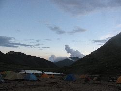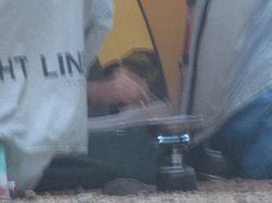 夕方から雨が降り出した。すぐに止むだろうとの予想ははずれた。17時ごろから雷も鳴り出した。やれやれと思ってシュラフにもぐりながら横になっていると、上から水滴が垂れてくる。あれ?よく見ると目止めのところから水が垂れてきているではないか。やや!と思って回りをみると同じように目止めのところから浸水しているではないか!汗拭き用タオルを使って急遽、テント内の拭き掃除をすることになった。すぐにタオルは水で一杯になる。なんどかしぼって雨が止むのをまった。今日は下痢に続き、今度は浸水かとトホホな気分だったが、このテントも20年の付き合いだ。そろそろ更改の時期かなとしみじみ。 ようやく雨も上がった。テントサイトでは遅い夕食を作っているグループがたくさんいたが、その中でやたらとジュージュー音を立てて調理している人がいた。テントの外に火器を置き、手と箸しか見えないので余計に気になる。私のテントの周りからも「ねえ、何作ってるんだろう、気になるよね」という声が多数。私個人的には彼を「Mr.ジュージュー」と命名し、トイレにいくふりをしてこっそり彼のテントの横を通ってみた。なんと、もやしを炒めていた。足の速い野菜をわざわざ持ってきたなあーと思ったがもしかして見間違いだったのだろうか。気になる・・・。